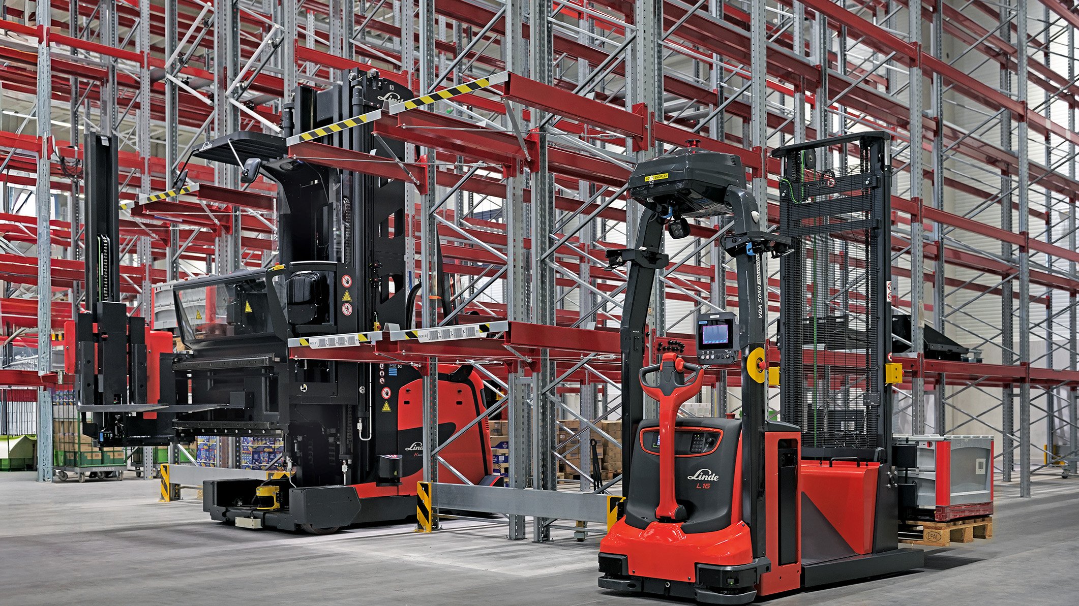 Ein weiteres Merkmal aller Automatisierungslösungen von Linde MH ist die tief in der DNA verankerte Sicherheitskompetenz: mehrfach redundante Systeme, präzise Sensorik oder spezielle Lichtlösungen, wie die „Red Warning Lights“ rechts und links des Fahrzeugs, schützen Personen, Waren, Maschinen und Infrastruktur. Damit wird nicht nur ein hoher Warendurchsatz pro Stunde erzielt, sondern auch sichergestellt, dass manuelle und automatisierte Prozesse reibungslos nebeneinander laufen können.