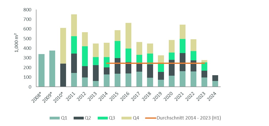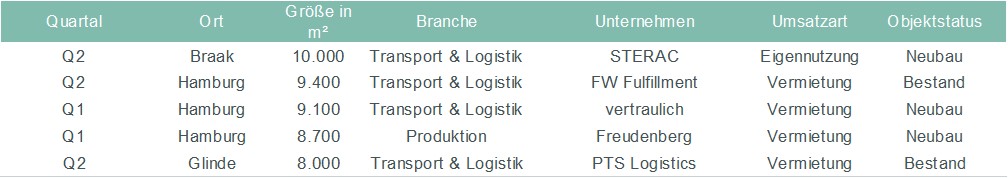 Neubauflächen hatten im ersten Halbjahr 2024 einen Anteil am Flächenumsatz von 43 Prozent. Das sind 23 Prozentpunkte mehr als vor einem Jahr. Auch der größte Abschluss im ersten Halbjahr entfiel auf einen Neubau, ebenso wie zwei weitere der drei größten Abschlüsse. Bei dem größten Abschluss handelte es sich um eine Eigennutzung von Sterac in Braak. Insgesamt kamen Eigennutzer auf einen Anteil von 14 Prozent – fünf Prozentpunkte weniger als vor zwölf Monaten.