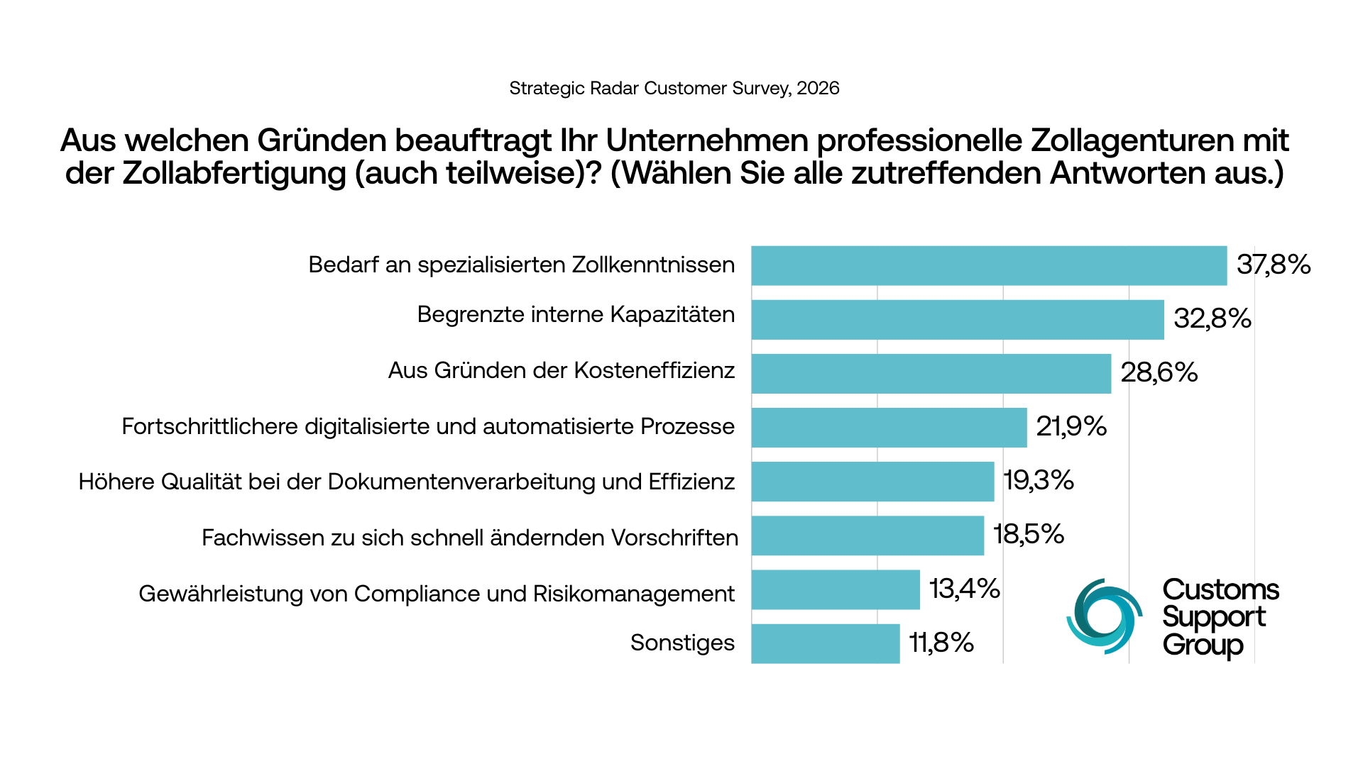 Der Mangel an spezialisiertem Zollwissen ist bei 38 Prozent der Befragten der Hauptgrund für