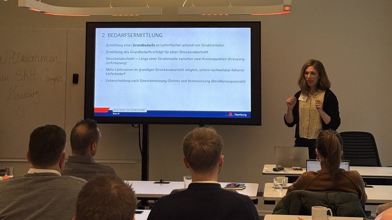 Darauf aufbauend erläuterten die Referentinnen die systematische Bedarfsermittlung von Lieferflächen anhand von Strukturdaten. Dabei werden Daten zur Gewerbenutzung und der Wohnbevölkerung einbezogen, woraus ein kombinierten Grundbedarf entsteht. Ergänzend wurden Ansätze zur Dimensionierung von Lieferflächen vorgestellt. Abschließend gaben die Referentinnen einen Ausblick auf das weitere Vorgehen.