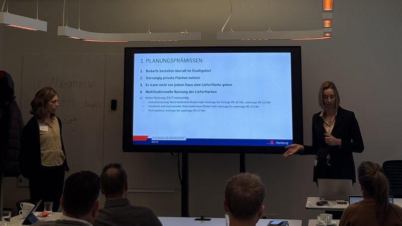 Im Anschluss stellte Fanny Krause,Referentin im Logistikreferat der BWAI, die geplante digitale Darstellung von Lieferzonen im Geoportal Hamburg vor. Künftig sollen Lieferzonen als offene Geodaten über standardisierte Schnittstellen bereitgestellt werden und damit sowohl für Verwaltung als auch für Logistikakteure leichter zugänglich sein. Die Veröffentlichung der entsprechenden Daten im Geoportal ist voraussichtlich ab März 2026 vorgesehen und stellt einen wichtigen Schritt zur besseren Transparenz und Planbarkeit von Lieferverkehren dar.